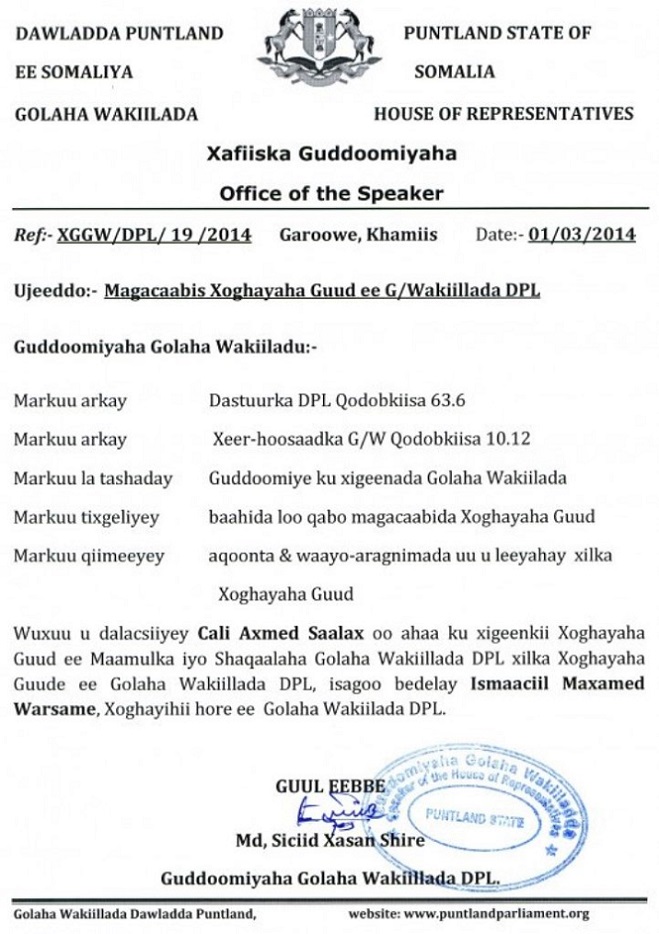 Hoos ka akhriso wareegto lagu magacaabay xoghayaha baarlamaanka Puntland: