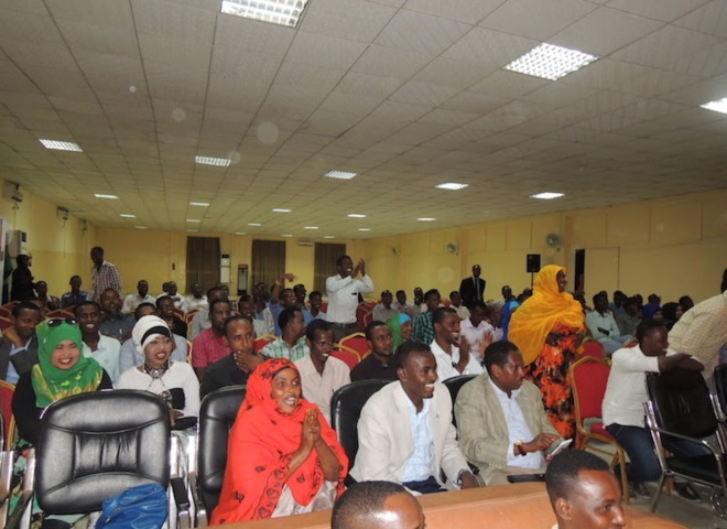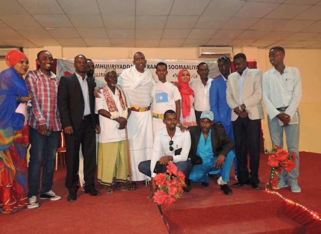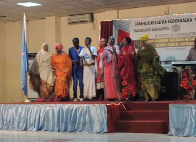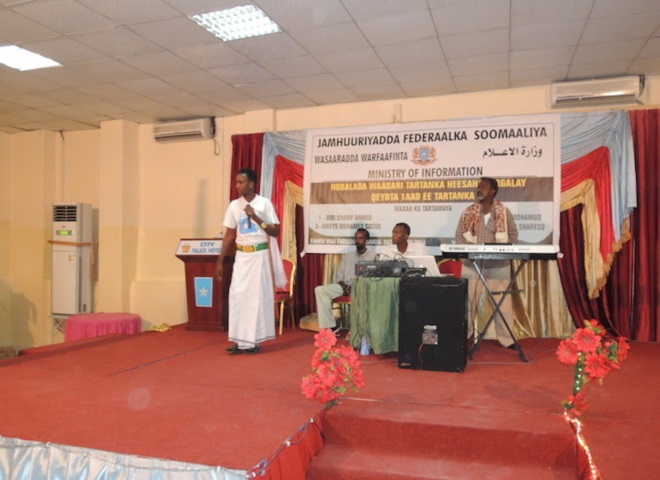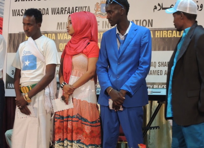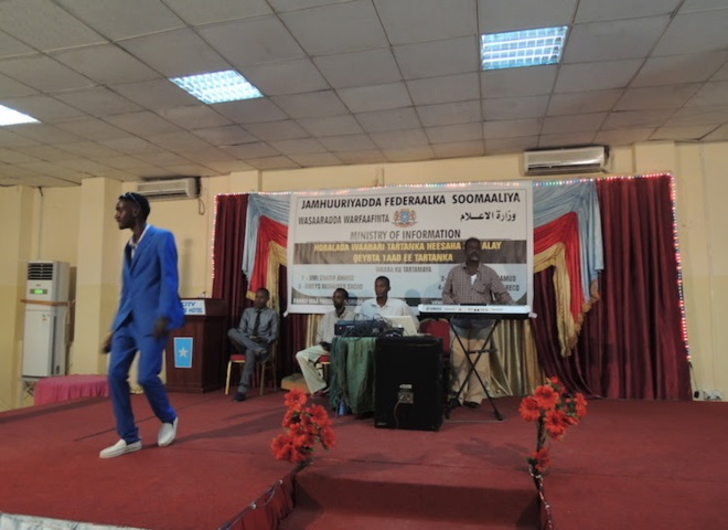 Axad, November 02, 2014 (HOL) — Wasiirka warfaafinta Soomaaliya, Mustafa Sh. Cali Dhuxuloow ayaa xalay ka qayb-galay tartanka heesaha hirgalay oo ay ku tartamayeen afar dhallinyaro ah oo tijaabinayay inay ka mid noqon karaan fannaaniinta Somalia. “Tartanka Heesaha Hirgalay wuxuu qayb ka yahay horumarinta fanka Soomaaliyeed,” ayuu wasiirka warfaafinta ka yiri goobta tartanka.