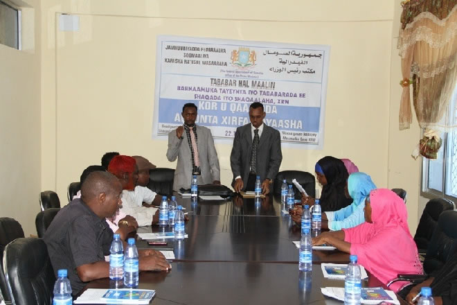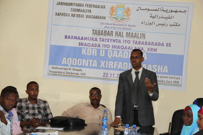 Isniin, November 24, 2014 (HOL) — Waaxda shaqada, shaqaalaha iyo tababarrada ee xafiiska Ra’iisul wasaaraha Somalia ayaa tababar soconayay maalin kuna saabsan kor u qaadidda aqoonta xirfadlayaasha u qabatay qaar ka mid ah shaqaalaha xafiiska, kaasoo qeyb ka ah barnaamijka tayeynta iyo tababarrada shaqada iyo shaqaalaha XRW ee uu ku dhawaaqay xoghayaha joogtada ah ee xafiiska ra’iisul wasaaraha, C/qaadir Cabdi Faarax.