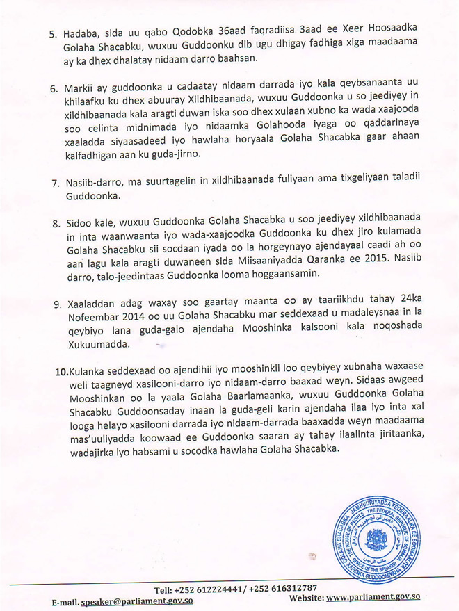Isniin, November 24, 2014 (HOL) — Guddoonka golaha shacabka ayaa manta go'aanno ka soo saaray khilaafka taagan, isgaoo xusay inuu khilaafka madaxda dalka saameyn xooggan ku yeeshay hay'adaha dowladda oo dhan.