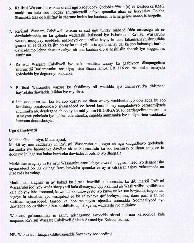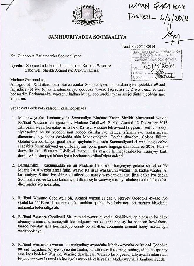 Haddaba halkan ka akhriso mooshinka laga gudbiyay ra’iisul wasaare C/weli Sheekh Axmed ayaa u qornaa sidan: