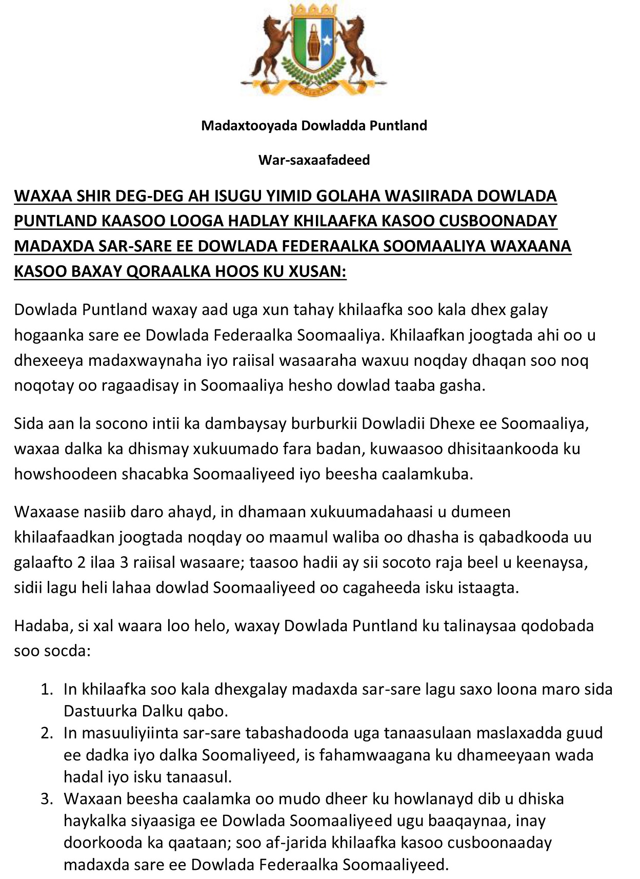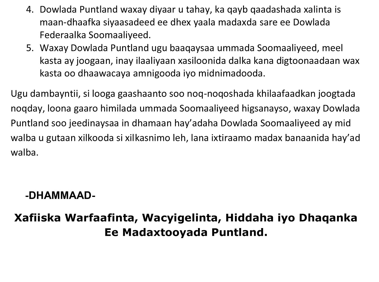 Waxaa sidoo kale lagu sheegay in Puntland diyaar u tahay inay qayb ka noqoto dadaallada lagu xalinayo khilaafkaas iyadoo beesha caalamkana loogu baaqay inay arintaas kaalintooda ka qaataan.