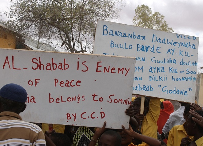 Dhinaca kale dadweynaha degmada Buulo-burte ayaa sitay boorar ay ku qornaayeen erayo ay ka mid ahaayeen; "Shabaab waa cadowga nabadda. Waxaan doonaynaa nabad ma doonayno dagaal" iyo kuwo kale.