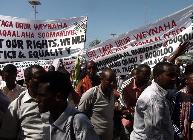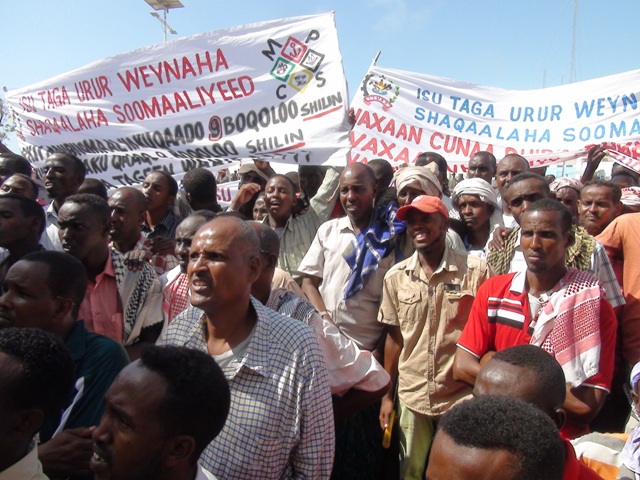 Talaado, September 23, 2014 (HOL) — Boqollaal ka tirsan xoogsatada dekedda weyn ee Muqdisho, xubinna ka ah isu-tagga ururka shaqaalaha Soomaaliyeed ee SCTU ayaa maanta dibadbax ka dhigay waddooyinka gala dekedda weyn ee Muqdisho illaa isgoyska Sayidka ee xarunta baarlamaanka Soomaaliya ku dhow, kuwaasoo watay boorar ay ku qoranaa erayo Afafka Soomaaliga iyo Ingiriiska ka koobnaa.
