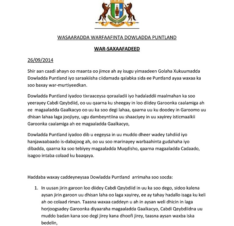 War-saxaafadeed kasoo baxay madaxtooyada ayaa lagu faah faahiyey ujeedada shirka iyo weliba qodobadii kasoo baxay, waxaana war-saxaafadeedkaas oo nuqul kamid ahi uu Hiiraan Online soo gaaray ugu horreyn lagu beeniyey hadalkii Madaxweynaha Galmudug ee ahaa in loo diidey garoonka Gaalkacayo inuu kasoo dego.