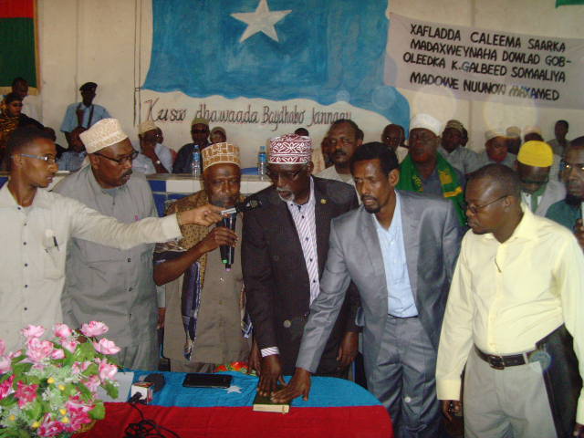 Xafladda dhaarinta ayaa lagu qabtay xarunta ADC-da Baydhabo oo ahayd halkii uu ka socday shirkii lagu dhisay maamulkan, iyadoo ay dhaarta goobjoog ka ahaayeen xildhibaanno ka tirsan baarlamaanka Soomaaliya.