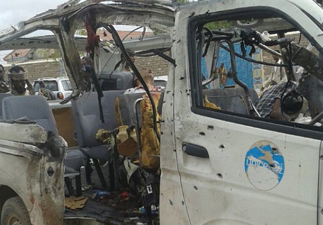 Isniin, Abriil 20, 2015 (HOL) — Ugu yaraan toddobo qof ayaa ku geeriyooday tiro intaa ka bandanna waa ay ku dhaawacmeen qarax saaka aroorti hore lala beegsaday gaari bus ah oo siday shaqaale ka tirsanaa hay’adda UNICEF.