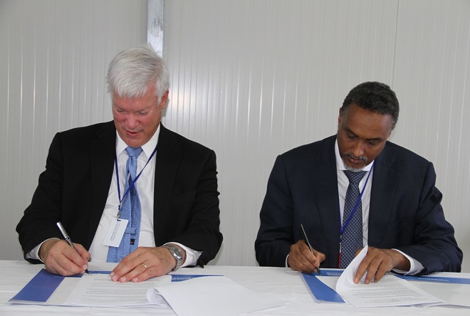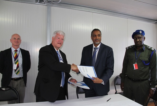 Sabti, Ogoosto 08, 2015 (HOL) — Wasiirka Maaliyadda Soomaaliya, Maxamed Aadan Ibrahim (Farkeeti) ayaa ergeyga gaarka ah ee dowladda Mareykanka u qaabilsan Somalia, James P. McAnulty Muqdisho kula saxiixday heshiis ay Maraykanku ugu deeqday lacag dhan $1.5 malyan oo lagu taageerayo dib u habeynta ciidamada booliiska Soomaaliya.