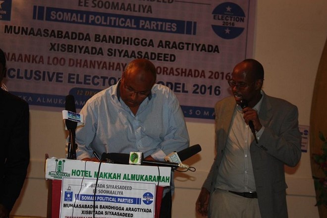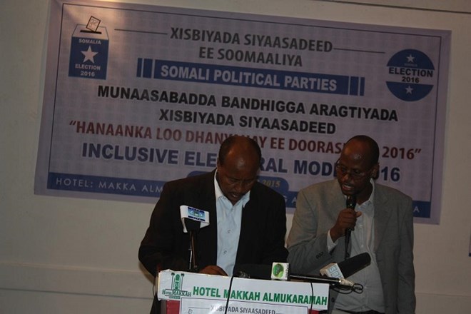 Bandhiggaan kaddib, waxaa madaxda 27–ka xisbi siyaasadeed ay si wadajir ah u saxiixeen hindisahan ku aaddan doorashada 2016, waxaana khudbado inta badan ahaa taageero kasoo jeediyay; guddoomiyaha golaha xisbiyada; ahna gudoomiyaha xisbiga Ileys, Muxiyadiin Cali Yusuf, guddoomiyaha xisbiga Daljir, Xil. Xasan Macalin Maxamuud, guddoomiyaha xisbiga Midnimo (Puntland), Dr Saadaq Eenoow, guddoomiyaha xisbiga Badbaado Qaran, C/qaadir Maxamed Xuseen [Jaahweyn] gudodomiyaha xisbiga cadaaladda iyo horumarka, Nadiifo C/llaahi Cabdi, guddoomiyaha golaha dhexe ee xisbiga Kulan, Muxyadiin Max'ed Xaaji Ibraahim iyo guddoomiyaha Xisbiga Qaran ee Is-bedelka & horumarka Dr Maxamed Cali Ibraahim. Waxaa kaloo xafladdan ka hadlay bulshada rayidka; sida nabad-doonno iyo culummaa’uddiin.