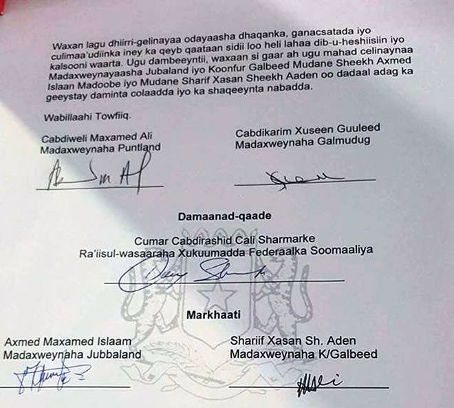 AKHRISO; Heshiiska ay saxiixeen Madaxweynayaasha Galmudug iyo Puntland;