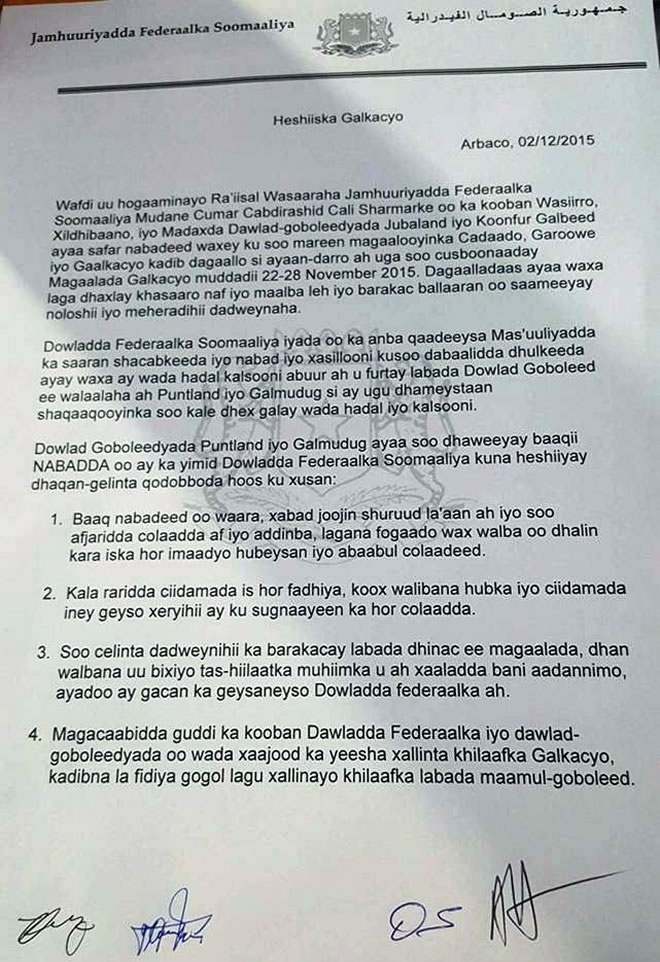 Arbaco, December 02, 2015 (HOL) — Magaalada Gaalkacyo ayaa waxaa maanta kulankii ugu horreeyay ku yeeshay madaxweynayaasha Galmudug, C/kraiin Xuseen Guuleed iyo Puntland, C/weli Maxamed Cali Gaas, kulankaas oo ay labada madaxweyne ku saxiixeen heshiis ka kooban afar qodob oo gun-dhig u ah sidii loo xallin lahaa colaadda Gaalkacyo ka taagan.