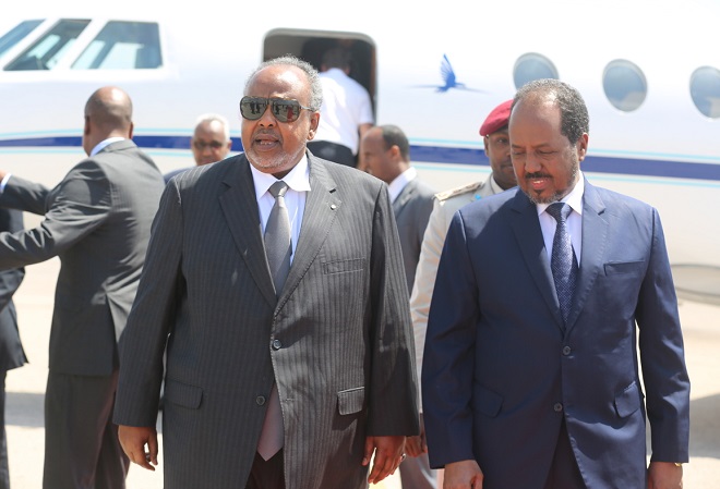 Axad, Feberaayo 22, 2015 (HOL) — Madaxweynayaasha Soomaaliya iyo Jabuuti, Xasan Sh. Maxamuud iyo Ismaaciil Cumar Geelle ayaa saaka ku wajahan magaalada Baladweyne ee xarunta gobolka Hiiraan, halkaasoo ah goobta ay ka howlgalaan ciidamada Jabuuti ee qaybta ka ah AMISOM.
