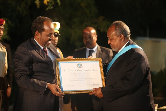 Axad, Feberaayo 22, 2015 (HOL) — Madaxweynaha Soomaaliya, Xasan Sh. Maxamuud ayaa billadda ugu sarreysa dalka guddoonsiiyay madaxweynaha Jamhuuriyadda Jabuuti, Ismaaciil Cumar Geelle oo xalay Muqdisho seexday, iyadoo sidoo kalena loo sameeyay xaflad casho-sharaf ah.