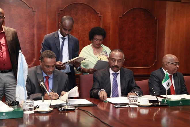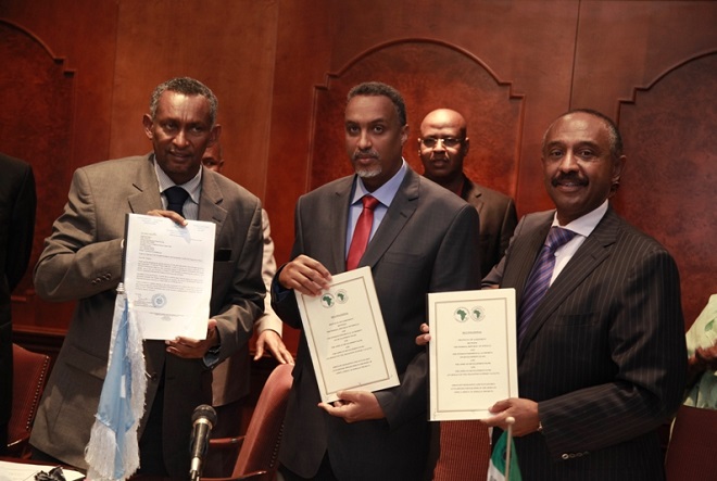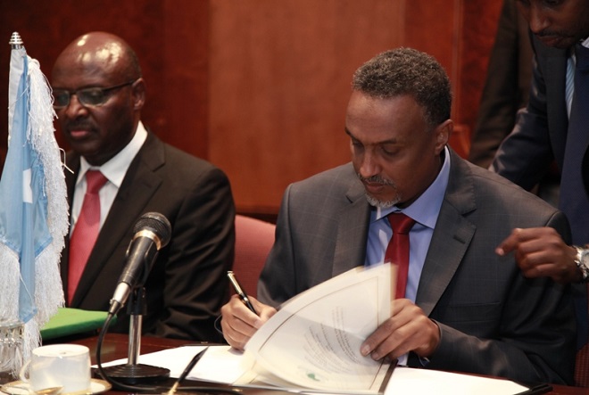 Khamiis, Feberaayo 26, 2015 (HOL) — Wasiirka maaliyadda Soomaliya, Maxamed Aadan Ibraahim ayaa heshiis saddex geesood ah kula saxiixday magaalada Addis Ababa ee dalka Itoobiya - Bangiga Horumarinta Africa iyo Urur Goboleedka IGAD, kaasoo qayb ka ah dadaalada lagu doonayo in lagula tacaalo abaaraha kusoo noq-noqda gobolka.