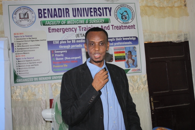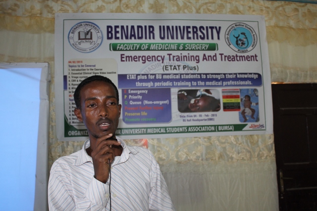 Khamiis, Feberaayo 05, 2015 (HOL) — Xarunta Jaamacadda Banaadir ee Muqdisho ayaa waxaa shalay gelinkii-dambe ka furmay tababar ku saabsan daweynta deg-degga ah (Emergency Training and Treatment) oo loo qabtay qaar ka mid ah ardayda kuliyadda caafimaadka ee Jaamacadda dhigta iyo kuwii horay uga qalin-jabiyay ee dhaqaatiirta noqday.