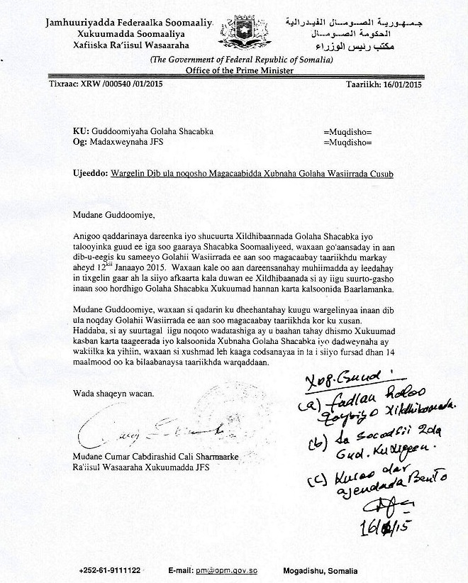 Warqadda ra’iisul wasaare Cumar C/rashiid Cali uu u soo gudbiyay baarlmaaanka oo uu ku dalbaday in waqtiga loo kordhiyo, uuna ku caddeynayay inuu golihii wasiirrada kala diray.