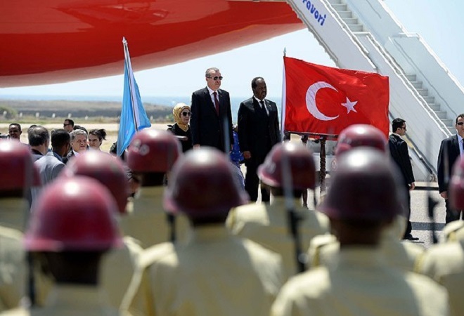 Madaxweynaha Turkiga ayaa wuxuu salaam ka qaatay ciidamada qalabka sida ee dowladda Soomaaliya, iyadoo dhiniciisa uu taagan yahay Xasan Sh. Maxamuud, iyadoo kooxda bambeyda ay garaaceen muusiga astaanta u ah labada calan ee Soomaaliya iyo Turkiga.
