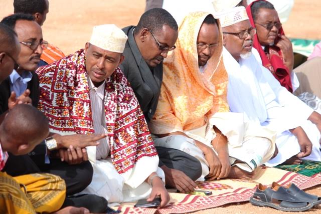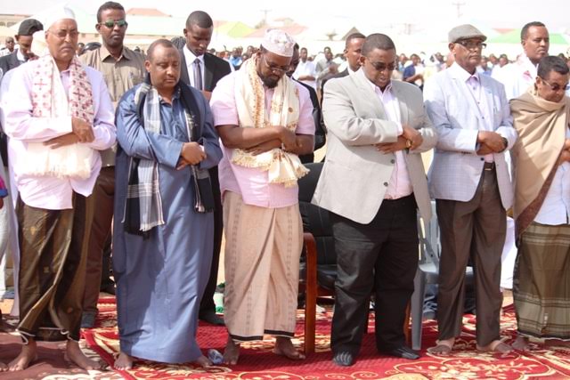 Ra’iisul-wasaare Cumar oo ay dhinacyada ka taagan-yihiin madaxweynaha Puntland Cabdiwali Maxamed Cali Gaas ,Madaxweynaha Jubbaland Axmed Madoobe iyo mas’uuliyiin ka tirsan maamulka gobolka Nugaal ayaa salaaddii Ciidda ku tukaday garoonka kubadda cagta ee magaalada Garowe.