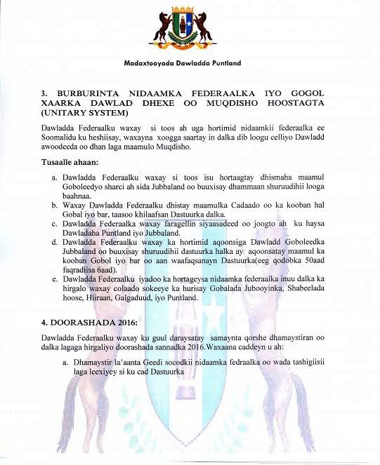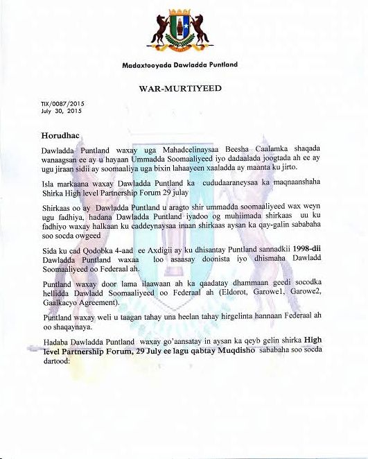 Waxaa kaloo Puntland ay War-saxaafadeedka ku xustay in Dowladda Soomaaliya ay kasoo Hor-jeeddo Hir-galinta Nidaamka Federaalka ah, isla markaan ay Qorshaynayso Dowladda Dhexe ee Muqdisho inuu iyada hoos-tago, Sida lagu sheegay War-saxaafadeedka.