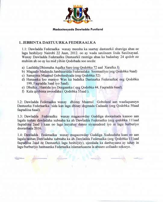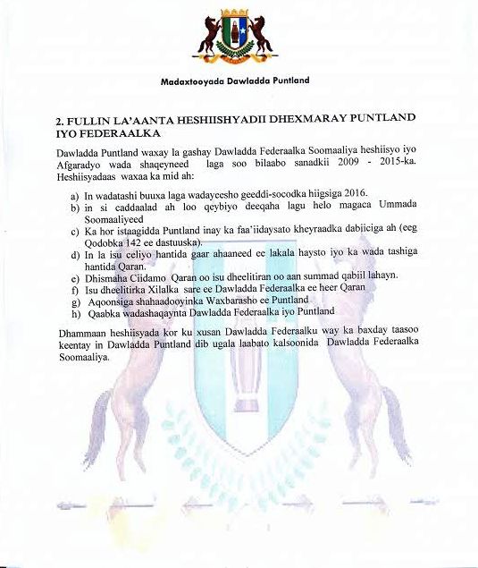 Puntland ayaa Arrintan u cuskatay Shan qodob oo mid kasta si gaar ah loogu faahfaahiyay, kuwaasoo lagu dhaliilayay Dowladda Federaalka Somalia, Wuxuuna Maamulku Xusay in Dowladda Soomaaliya ay Jabisay Dastuurkii lagu Heshiiyay, isla markaana ay ka baxday Heshiisyo horay loo Wada-saxiixday.