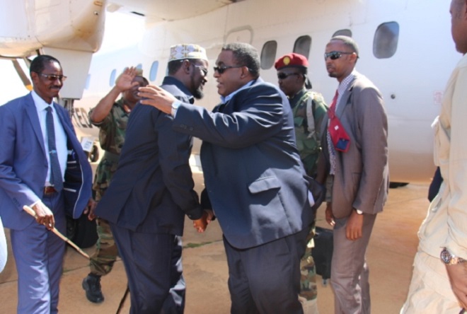 Wafdiga RW Cumar C/rashiid Cali ayaa waxaa garoonka diyaaradaha degmada Kismaayo kusoo dhaweeyay madax uu ka mid yahay madaxweynaha Jubba, Sheekh Axmed Madoobe iyo xubnaha labada gole ee Maamulkiisa.