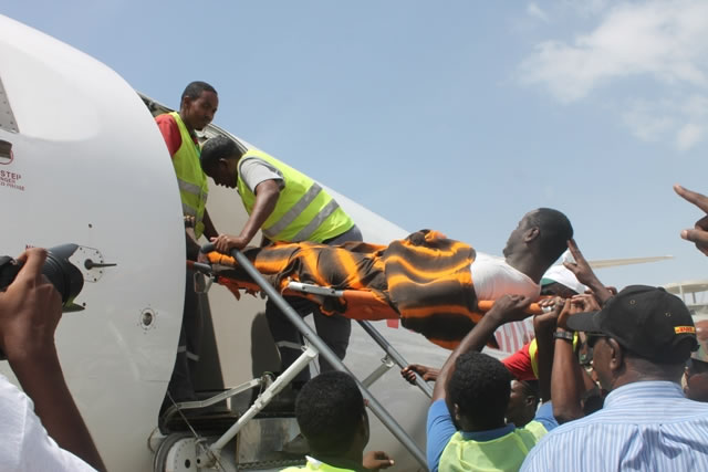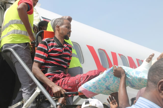 Axad, Maarso 01, 2015 (HOL) — Garoonka diyaaradaha Muqdisho ayaa laga dhoofiyay maanta 13-ruux oo ka mid ah dadkii ku dhaawacmay weerarkii is-miidaaminta ahaa ee bishii hore ka dhacay Hoteelka Centarl ee Magaalada Muqdisho.