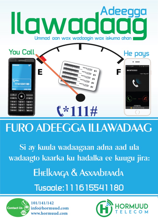 Khamiis, Maarso 19, 2015 (HOL) — Shiradda isgaarsiinta Hormuud Telecom ayaa soo bandhigtay adeeg cusub oo loogu magac daray "ILA-WADAAG", kaas oo caalamka oo dhan laga isticmaalo.