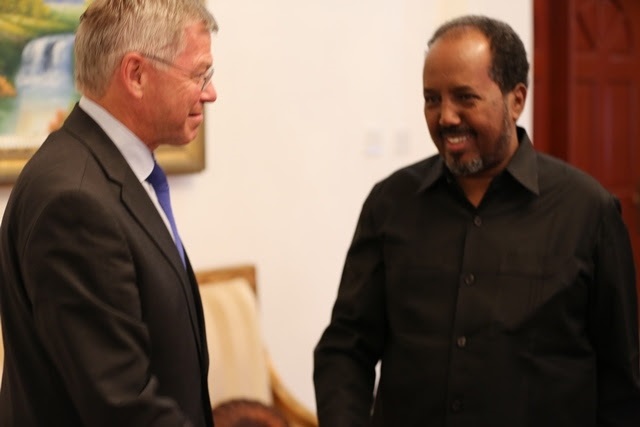 Khamiis, November 26, 2015 (HOL) — Madaxweynaha Somalia, Xasan Sh. Maxamuud ayaa xafiiskiisa ku qaabilay ra’iisul wasaarihii hore ee Norway, Kjell Magne Bondevik oo haatan ah madaxa hay’adda loo yaqaano Oslo Centre for Peace and Human Rights.
