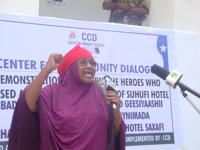 "Labo sano ka hor halkan cadawga ayaa laga xoreeyay, waxaa rabnaa inaan u sheegtay inay suuro-gal noqon doonin inay halkan ku dhuumaaleystaan oo ay na qarxiyaan kuwa argagixisada, gaari qarax lagu soo raro shacabka ma laynayno ayaa leedihiin, war shacabka waxba uma reeban, waa na baabi'seen, haween Soomaaliyeed ayaa asaay u saarteen, waa cambaareyneynaa, waa fal fuleynimo ah, umana jiifan doono shaqada way soconeysaa," ayay tiri Jawaahir Baarqab.