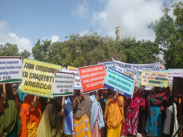 Dibad-baxayaasha ayaa kusoo uruuray xarunta dowladda hoose, iyagoo watay boorar ay ku qornaayeen halku dhigyo kala duwan, waxaana bannaan-baxa soo qaban-qaabisay hay'adda wadahadalka bulshada ee CCD.
