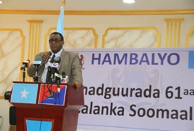 Isniin, Oktoobar 12, 2015 (HOL) — Ra’iisul Wasaaraha Soomaaliya, Cumar C/rashiid Cali Sharmarke oo khudbad ka jeediyay munaasabad ka dhacday xarunta Dowladda Hoose ee Muqdisho oo lagu maamuusayay 61-guuradii kasoo wareegtay maalinta Calanka Somalia.