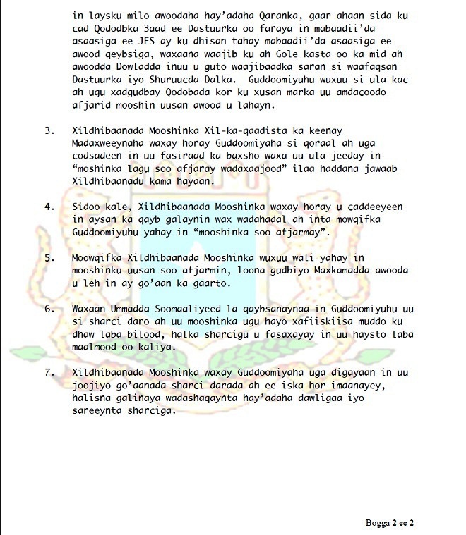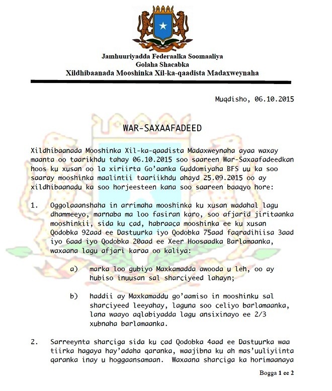 Talaado, Oktoobar 06, 2015 (HOL) — Xildhibaannadii 12-kii bishii Ogoosto ee sannadkan mooshinka ka keenay madaxweynaha Somalia Xasan Sh. Maxamuud ayaa kulan ay maanta ku yeesheen Muqdisho kasoo saaray war-saxaafadeed ay uga soo hor-jeedaan go’aankii uu mooshinkooda kasoo gaaray guddoomiyaha baarlamaanka federaalka Soomaaliya.