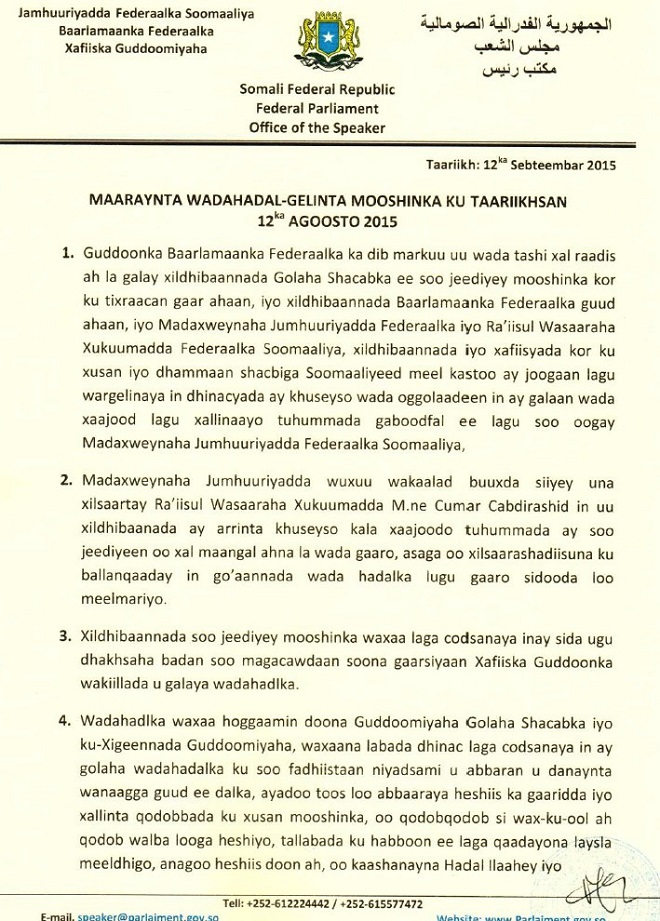 Axad, September 13, 2015 (HOL) — Guddoomiyaha Baarlamaanka Somalia, Maxamed Sheekh Cismaan [Jawaari] ayaa qoraal uu soo saaray ku sheegay in dhinacyada isku haya Mooshinnada iska horjeeda ee Baarlamaanka la keenay ay isugu yimaadaan Miiska Wada-hadalka.