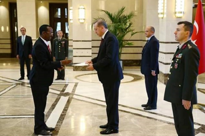 Arbaco, September 16, 2015 (HOL) — Safiirka Cusub ee Dowladda Somalia ay dhawaan u Magacowday Dalka Turkiga, Cabdullaahi Maxamed Cali [Sanbaloolshe] ayaa si rasmi ah looga guddoomay Warqadaha aqoonsiga Safiirnimo, kaddib kulan uu Ankara kula yeeshay madaxweynaha Turkiga, Reccep Tayyip Erdogan.