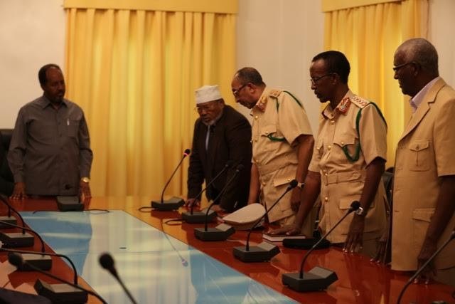 Khamiis, September 24, 2015 (HOL) — Madaxweynaha Somalia Xasan Shiikh Maxamuud ayaa maanta lagu Hor-dhaariyay Taliyaha Cusub ee Ciidanka Xoogga Soomaaliya, S/Gaas Maxamed Aadan Axmed iyo Abaanduulaha CXDS, S/Guuto Cali Baashi Maxamed Xaaji Cumar.