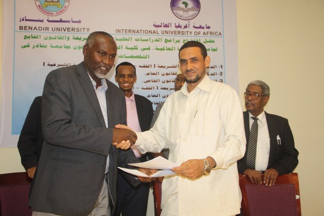 Guddoomiyaha Jaamacada Banaadir, Dr. C/risaaq Axmed Dalmar oo isagana munaasabada khudbad ka jeediyey ayaa xusay in dadaal badan kaddib ay jaamacadu ku guuleysatay inay soo kordhiso qaybta taqasuska ee kuliyada qaanuunka & shareecada iyadoo la kaashaneysa International University of Africa ee dalka Sudan.