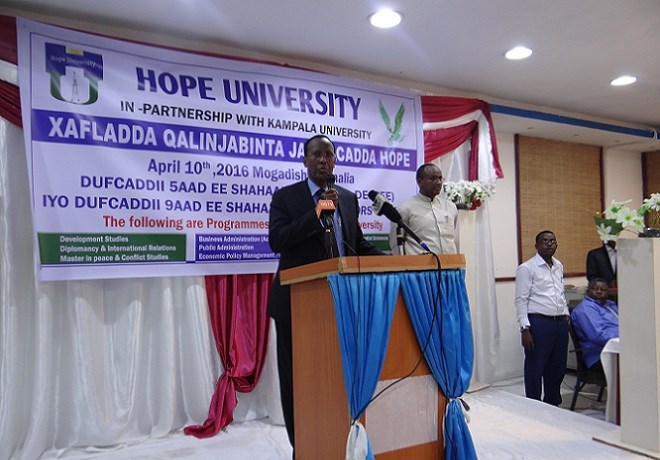 Axad, Abriil 10, 2016 (HOL) — Arday tiradoodu ahayd 242 ayaa maanta ka Qalin-jabiyay Jaamacadda Hope ee magaalada Muqdisho, iyadoo Ardaydaan ay isugu jireen kuwo qaatay Shahaada koowaad ee Bachelor-ka iyo kuwo Qaatay Shahaadada labaad ee Master-ka.