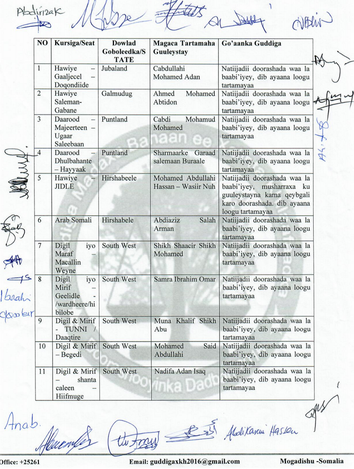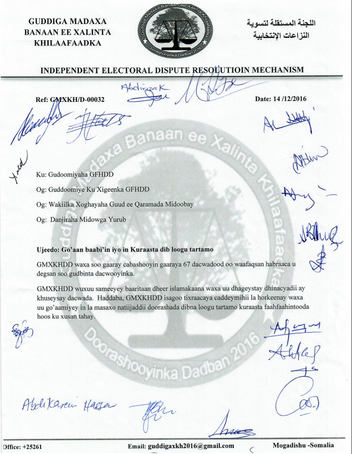 Guddiga xalinta khilaafaadka oo si rasmi ah u joojiya doorashada 11 xildhibaan [Akhriso]
