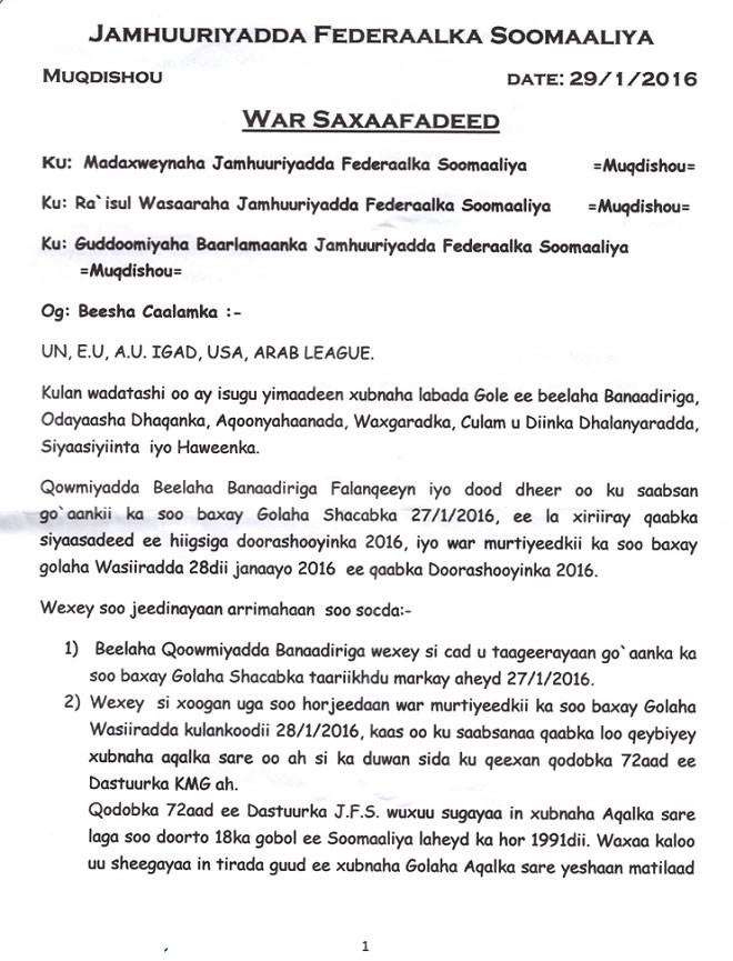 Sabti, Janaayo 30, 2016 (HOL) — Kulan ay Golayaasha Beelaha Banaadiriga ku yeesheen Muqdisho Jimcihii shalay oo taariikhdu ahayd 29-kii Jannaayo, ayaa Waxay kasoo saareen Bayaan ay ku taageereen go’aankii kasoo baxay baarlamaanka Somalia kasoo ku aaddanaa doorashada dalka ka dhacaysa Sannadkan 2016, ayna kasoo hor-jeedaan war-murtiyeedkii kasoo baxay Golaha Wasiirrada 28-kii bishan Jannaayo.