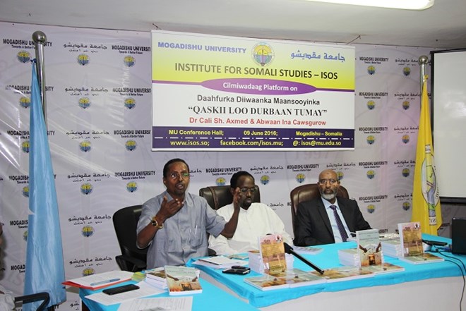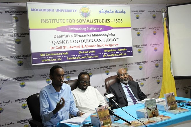Khamiis, Juun 09, 2016 (HOL) — Machadka Daraasaadka Soomaalida - (ISOS) ee Hoos-taga Jaamacadda Muqdisho, ayaa maanta oo ay Taariikhdu ku beegan tahay 09-ka Juun, 2016-ka Wuxuu Qabtay Xaflad lagu Daah-furayay Buugga Diiwaanka Maansooyinkii la magac-baxay "Qaskii Loo Durbaan Tumay" oo ay Maskaxdooda ka soo maaxatay labada hal-abuur, Dr. Cali Sh. Axmed Abuubakar oo ay Bulshada Soomaaliyeed ku Tiqiinay Aabbihii Waxbarashada Soomaaliyeed xilligii burburka iyo Abwaanka Soomaaliyeed C/rashiid Cumar Axmed (Ina Caws-gurow) oo ay bulshada Soomaaliyeed ku taqaanno Saarka, Diiwaankaan oo la daabacay Maarso, 2016-ka.