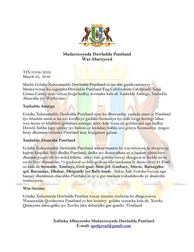 Sidoo kale, Wasiirrada Puntland ayaa ka warbixiyay abaaraha ka jira Puntalnd oo ay ku sheegen in 65% ay dhulka Puntland saameyn baahsan ku yeelatay.