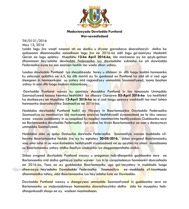 Jimco, May 13, 2016 (HOL) — Maamulka Puntland ayaa War-saxaafadeed ay soo saareen ku sheegay in Guddoonka Baarlamaanka Federaalka Somalia iyo xildhibaanno ay Caqabad ku yihiin Anisxinta iyo Meel-marinta heshiisyadii ay Garoowe ku kala saxiixdeen Puntland iyo Dowladda Federaalka Soomaaliya.