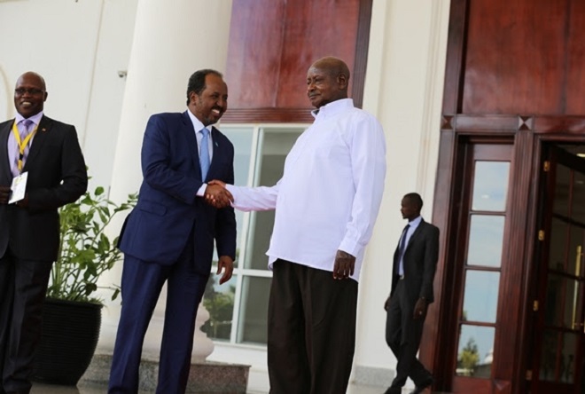 Jimco, May 13, 2016 (HOL) — Madaxweynaha Somalia Xasan Sheekh iyo dhiggiisa dalka Uganda, Yoweri K. Museveni ayaa maanta kulan ay ku yeesheen madaxtooyada Uganda ee Entebbe, iyagoo kaga hadleen qodobo dhawr ah oo ay ka mid tahay dib u dhiska ciidamada Soomaaliya.