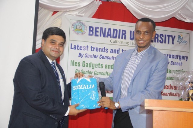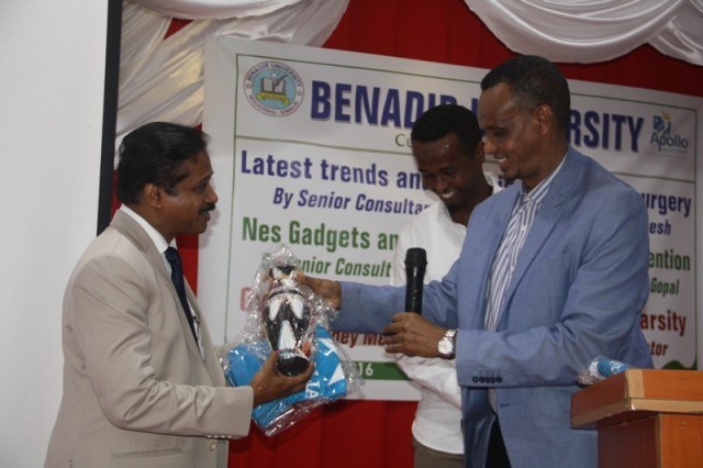 Ugu dambeyn gudoomiyaha jaamacada Banaadir Dr. C/risaaq Axmed Dalmar ayaa munaasabadaas hadiyado iskugu jiray funaanado calanka Somalia laga sameeyey, qalabka hidaha iyo dhaqanka qaarkood & astaanka Qaranka Somalia waxaa uu halkaas ku gudoonsiiyey xubnaha wafdiga ka socday isbitaalka Apollo ee wadanka India si aad ah ugu farxay.