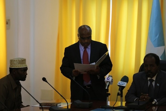 Madaxweynaha Somalia oo hadal kooban ka jeediyey munaasabadda dhaarinta ayaa faray dhammaan hay’dahaha Dowladda Soomaaliya inay la shaqeeyaan guddoomiyaha cusub ee maxakmadda sare.