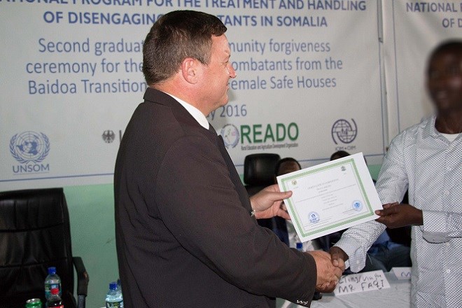 Madaxa UNSOM DDR Officer, Patrick Loots ayaa dhallinyarada Qalin-jabisay wuxuu ugu hambalyeeyay guusha ay barnaamijkan ka gaareen, Wuxuuna shacabka ku Guubaabiyay in ay gacan ka geystaan sidii ay dhallinyaradan bulshada dib ugu dhex-geli lahaayeen.