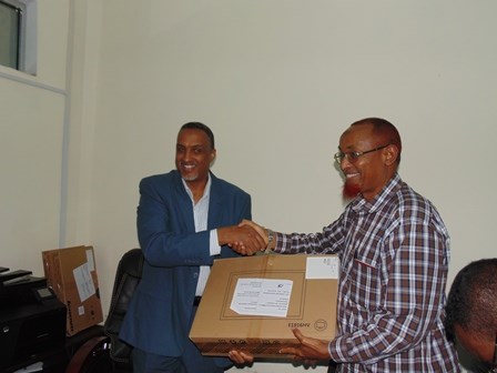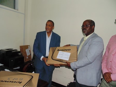 Axad, May 08, 2016 (HOL) — Wasiirka Maaliyadda Somalia Maxamed Aadan Ibraahim [Ferkeeti], ayaa maanta ku wareejiyay qalab kala duwan oo ka koobanaa; Kombuyuutaro, Laabtoobyo, Birintiro iyo Footokoobiyo hay’adaha Dowladda Federaalka Soomaaliya.