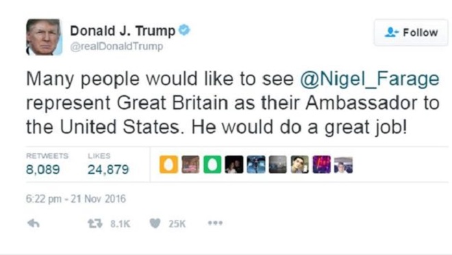 Donald Trump ayaa Hadalkan ku qoray bartiisa Twiteer-ka. "Dad badan ayaa jeclaan lahaa inay arkaan Mr Farage oo ah Wakiilka Britain u Qaabilsan Maraykanka. Shaqo adag ayuu qaban lahaa," ayuu qoray Donald Trump.