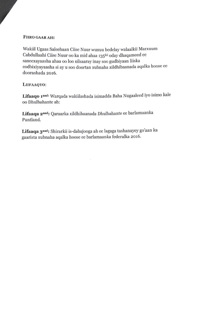 "Waxaan guddiga sharafta leh ee xallinta khilaafaadka u soo gudbinayaa caddaalad darro iyo is-hortaag lagu sameeyey hannaankii iyo waxqaybsigii ay ku heshiiyeen Beelaha Baha-Nugaaleed ee Dhulbahante xubnaha baarlamaanka ee aqalka hoose ee baarlamaanka federaalka kuwaas oo buuxiyey tallaabooyinkii loo dajiyey habraaca doorashada ee khuseeya xulidda xildhibaanada aqalka hoose 2016". Qoraalkii ayaa sidaa lagu xusay.