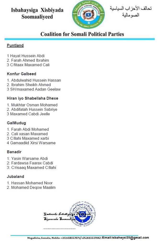 Isniin, Oktoobar 10, 2016 (HOL) — Isbahaysiga Xisbiyada Siyaasadda Dalka oo gacan ka helaya hay’ad la dagaalanta musuq-maasuqa ayaa Caawa soo saareen liiska Xubnaha Kor-joogtada uga Noqonaya Doorashooyinka Dadban ee dalka ka dhacaya.